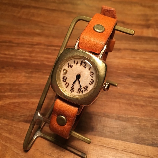 真鍮の好きなところを時計にしました。 素材の雰囲気を大切にして作りたかったので、 一番最初に着色しない事と数字を入れない事が決まっていました。 インデックスの三角は銀になります。 ※ベルト色変更をご希望でしたら備考欄に記載をお願いいたします。 その他何かご希望ございましたら何でもご相談ください。 ケースサイズ:直径約38mm ベルト幅 :約18mm ご注文いただいてから制作いたしますのでご注文から2週間ほどお時間いただいての発送になります。 ご了承ください。